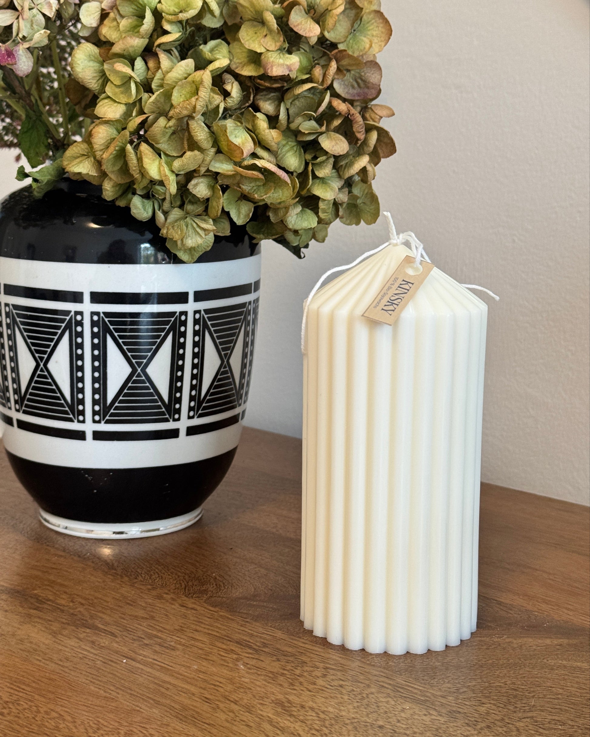 Geriffelte Stumpenkerze für extra lange Brenndauer - jede Kerze ist ein Unikat und wird von Hand in Brandenburg hergestellt.